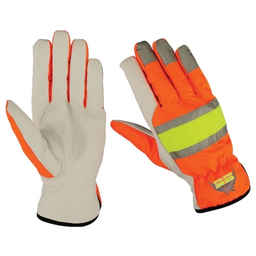 Safety Gloves Plam goat skin Leather back florescent Cloth orange color index finger keystone thumb reflector tips with fleece lining piping black color.