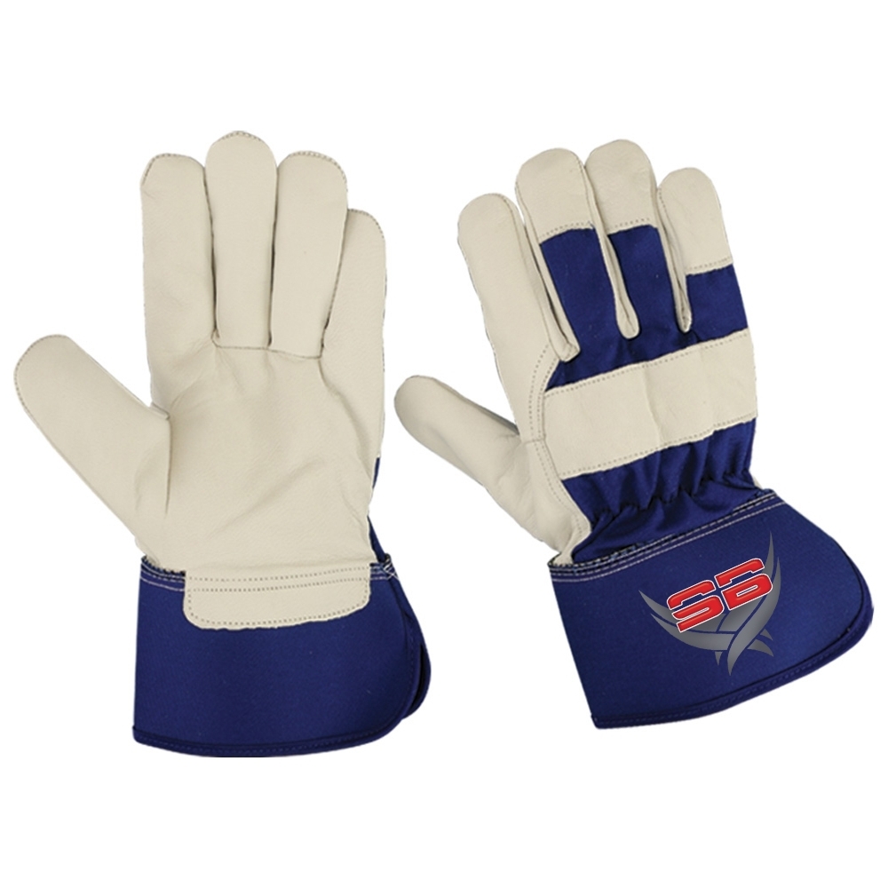 Plam crust cowhide leather gloves three finger tips royal bule cotton fabric back and shirred elastic on back wing thumb index finger rubberized cuff blue piping.