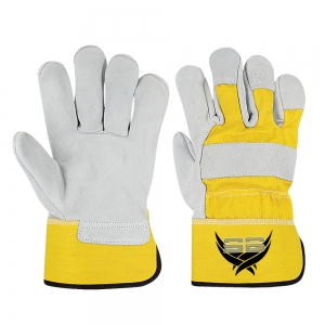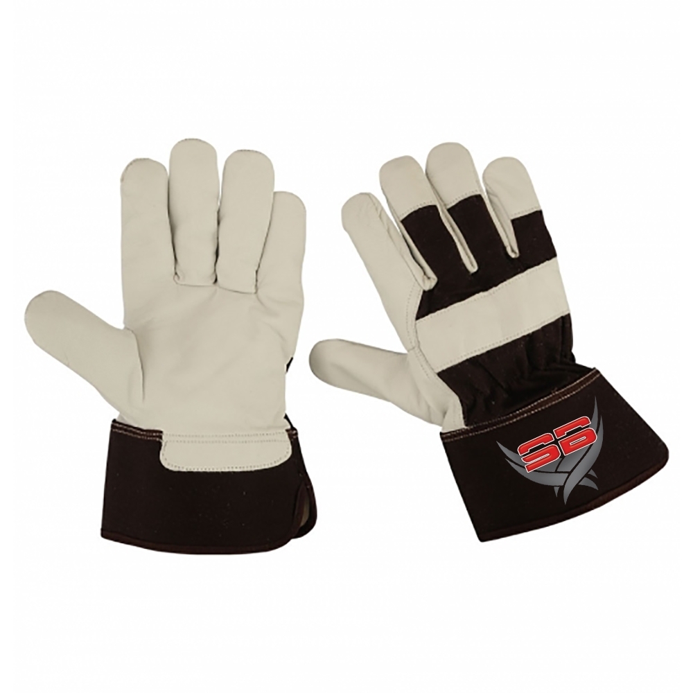 Palm crust goat leather gloves high quality three finger tips dark brown cotton fabric and shirred elastic on back wing thumb index finger rubberized safety cuff brown piping