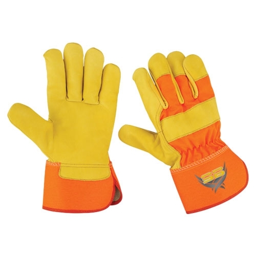 Palm yellow cowhide leather gloves three finger tips orange cotton fabric back and shirred elastic on back wing thumb index finger rubberized safety cuff orange piping.