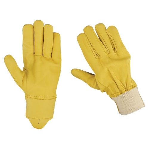 Full yellow cowhide leather gloves wing thumb & straight finger pulse protection and wrist elastic.