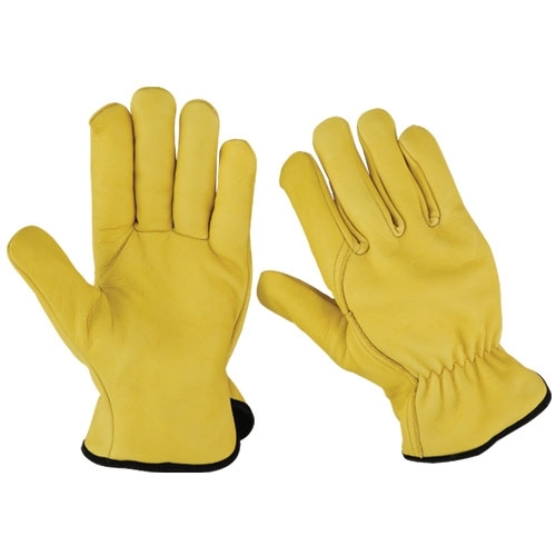 Full yellow cowhide leather gloves wing thumb & index finger shirred elastic inside full fleece lining and back black piping.